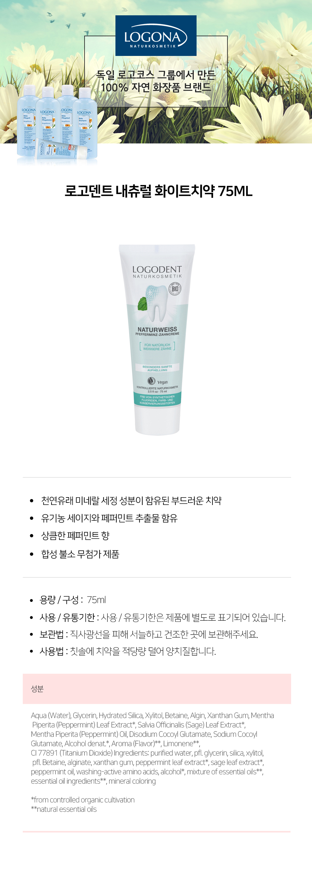 로고덴트 내츄럴 화이트치약 75ml X3